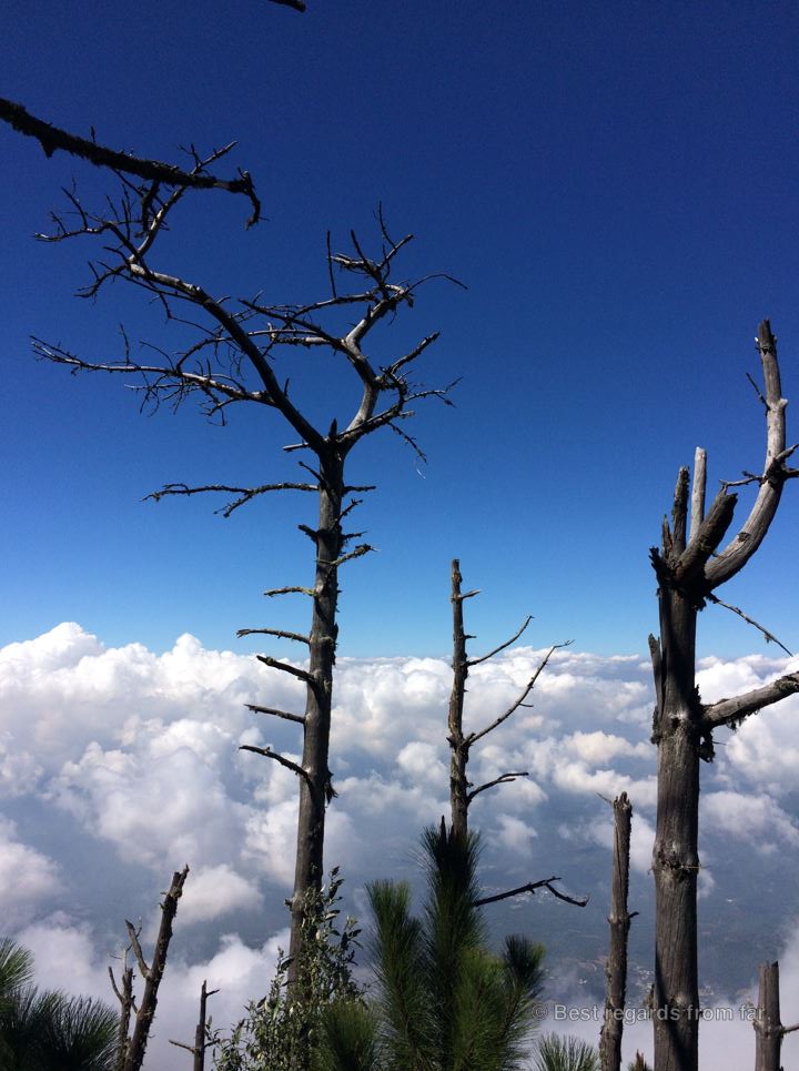 At the foot of the Acatenango, looking at its steep slopes, we realized that the trail was going pretty much straight up: the short 7-kilometer hike presents a positive elevation of more than 1650 meters to reach the summit at 3976 meters. If the first part through farming plots with the dramatic back drop of the volcano went up gently, the dusty and powdery soil didn’t facilitate our progression. With our heavy back packs and blessed walking sticks, we made it up through the cloud forest passing by gigantic trees. A third ecosystem of pine trees, being killed one by one by an insect as big as a rice grain, lead us to the last landscape of the black moon-like crater.