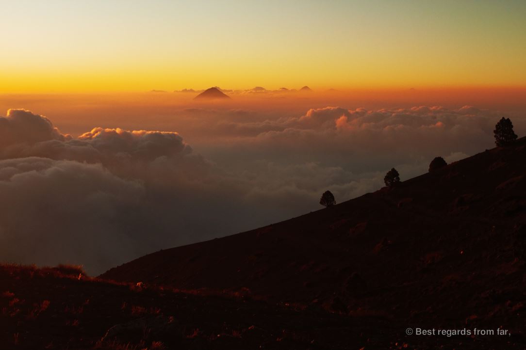 To vainly try to find a protection from the wind, we pitched at the foot of the very last uphill trying to not take off with the tent that felt more like a giant kite. Admiring the fantastic view above the clouds on the volcanoes surrounding lake Atitlan, I kept my sight high so that the moment wouldn’t not be spoiled by the piled up trash. The very last bit of ascent was incredibly tough as the air felt thin because of the altitude making my breathing shallow. Every step up seemed to take me two steps down, as I kept sliding in the volcanic pebbles. Eventually reaching the very top, volcano Fuego revealed itself, at last, linked to us by a 4-kilometer ridge. The shadow of the perfect conic shape of the Acatenango was projected by the sunset light on a layer of clouds next to the imposing Agua volcano. I was so cold in the strong winds that I was wondering if I shouldn’t sleep in the next morning instead of coming back up.