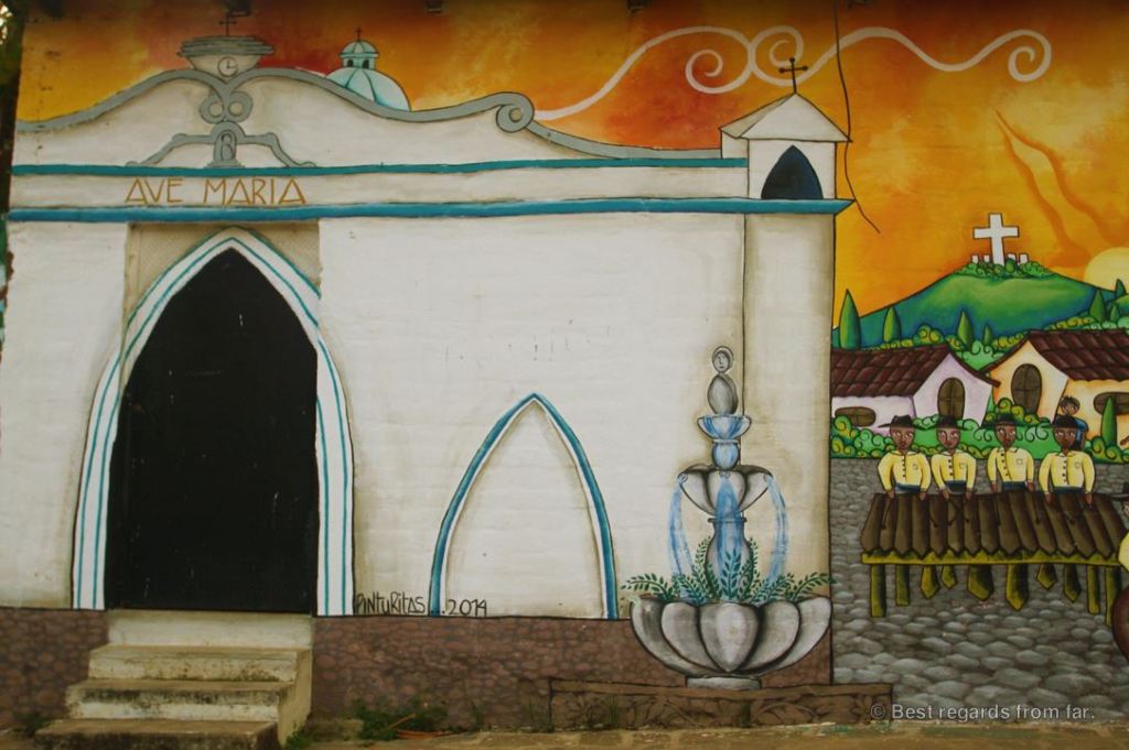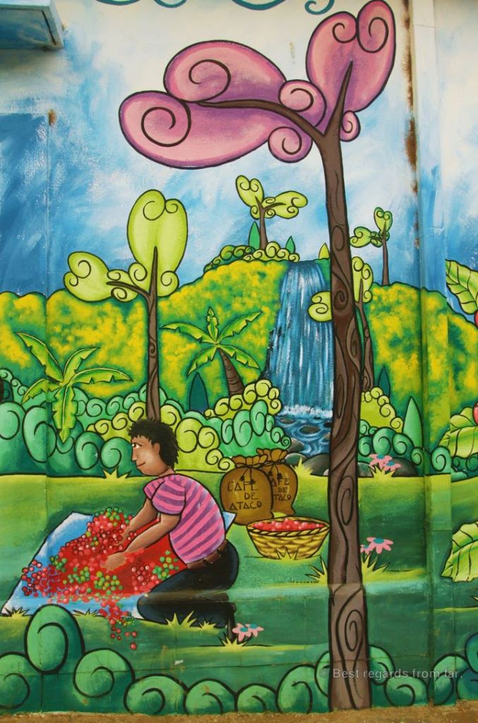 I am walking the streets of Ataco, a tiny village situated along the Ruta de las Flores (the route of flowers), a 36-kilometre-long (22.4 miles) route between Sonsonate and Ahuachapán in the West of El Salvador. Famous for its colourful and meaningful murals, Ataco surprises us with its touching and cheerful wall paintings.