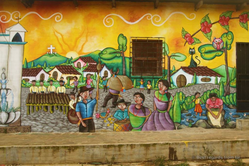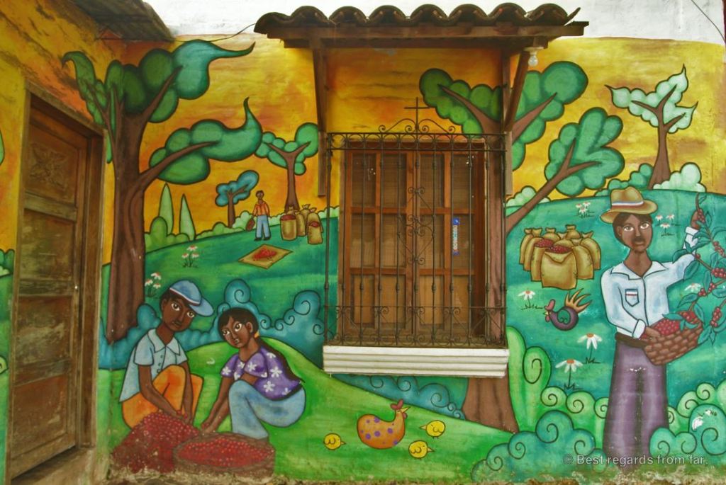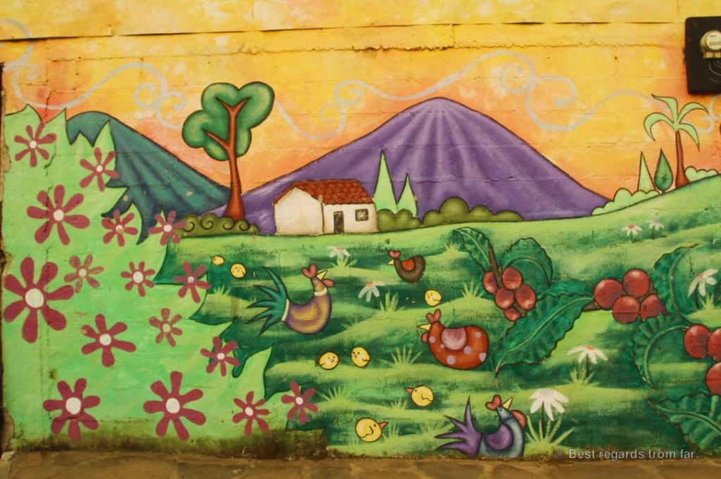 A mean of expression at first, certain murals are a strong reminder of the civil war and convey a clear political meaning. Others focus on bringing educational values to kids and parents, and describe a peaceful environment, with joyful coffee harvests, local ceremonies and bucolic scenes.