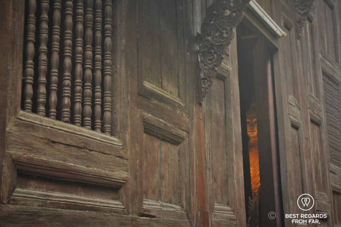 The enormous statue is framed by elephantine teak pillars that are hundreds of years old. 26 other pillars support the rest of the dark wooden roof above us.